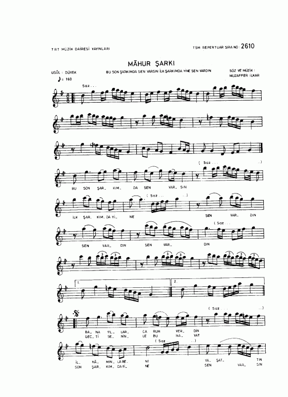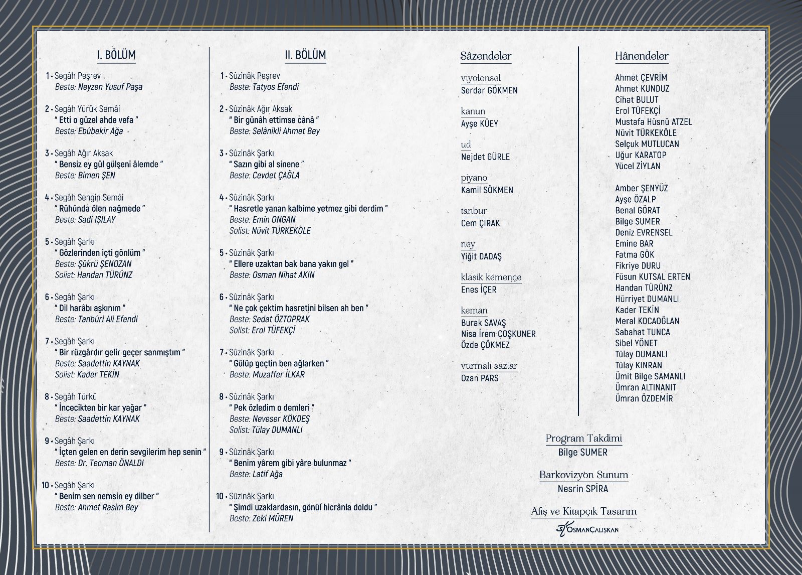 1-Mâhur Sengin Semâî, Halâ Kanayan Kalbimi Aşk Ateşi Dağlar, Güfte Şâiri: Y. Sinan Ozan, Bestekâr: Yorgo Bacanos2-Mâhur Sengin Semâî, Gel Bir Daha Gül Rûyini Aç, Güfte Şâiri: Faik Ali Ozansoy, Bestekâr: Udî Selânikli Ahmet Bey3-Mâhur Yürük Semâ, Yine Zevrâk-ı Derûnum, Güfte Şâiri: Şeyh Galip, Bestekâr: Hamamizâde İsmail Dede Efendi4-Mâhur Şarkı Ne Doğan Güne Hükmüm Geçer, Güfte Şâiri: Cahit Sıtkı Tarancı, Bestekâr: Münir Nurettin Selçuk5-Mâhur Şarkı, Ver Sâkî Tazelendi Derdim Bu Gece, Güfte Şâiri: Cemâl Ethem Yeşil, Bestekâr: Tanbûri Refik Fersan6-Mâhur Şarkı, Gösterip ağyâre lûtfun bizlere bîganesin, Bestekâr: Hacı Arif Bey7-Mâhur Şarkı, Ben Güzele Güzel Demem, Güfte: Karacaoğlan, Bestekâr: Sadettin Kaynak8-Mâhur Şarkı, Bahar Penbe Beyaz olur, Güfte ve Beste: Neveser Kökdeş9-Mâhur Şarkı, Çek küreği güzelim uzanalım Göksu'ya, Bestekâr: Arif Sami Toker10-Mâhur Şarkı, Düştün yine bir şûh-i sitemkâre gönül vay, Bestekâr: Lâtif Ağa11-Mâhur Şarkı, Bu son şarkımda sen varsın ilk şarkımda yine sen vardın, Bestekâr ve Güfte Şairi: Muzaffer İlkar12-Mâhur Şarkı, Gittin gideli ben deli divâneye döndüm, Bestekâr: Nuri Halil Poyraz13-Mâhur Şarkı, Sabâ Tarf-ı Vefâdan Peyâm Yok Mu? - Bestekâr: Enderûnî Hâfız Hüsnü Efendi14-Mâhur Şarkı, Yüce dağdan esen rüzgâr, Bestekâr: Selahattin Pınar Güfte Şairi: Fakih Fakılar